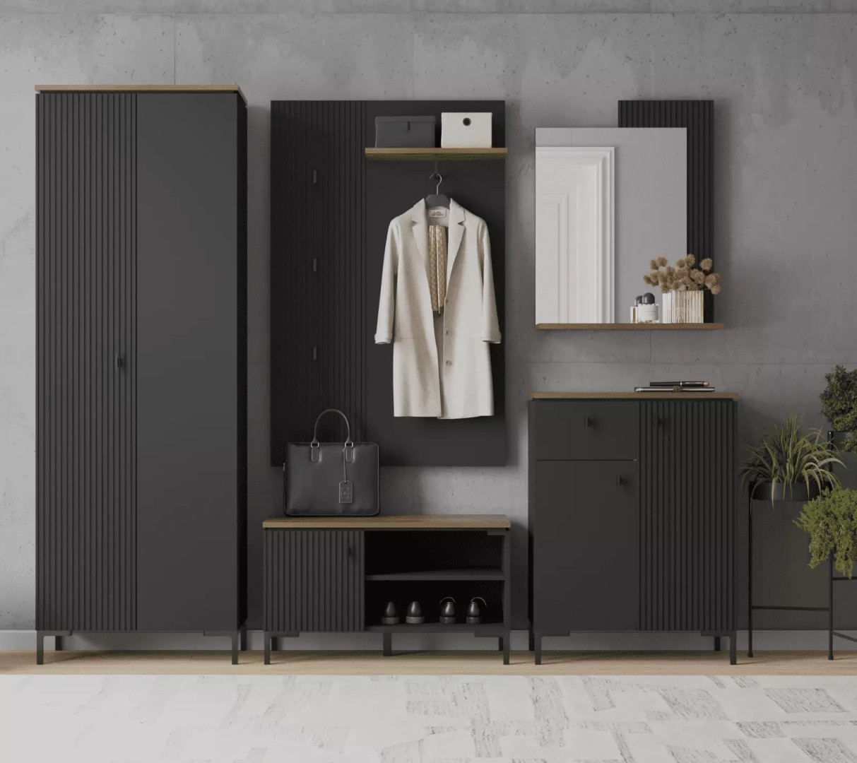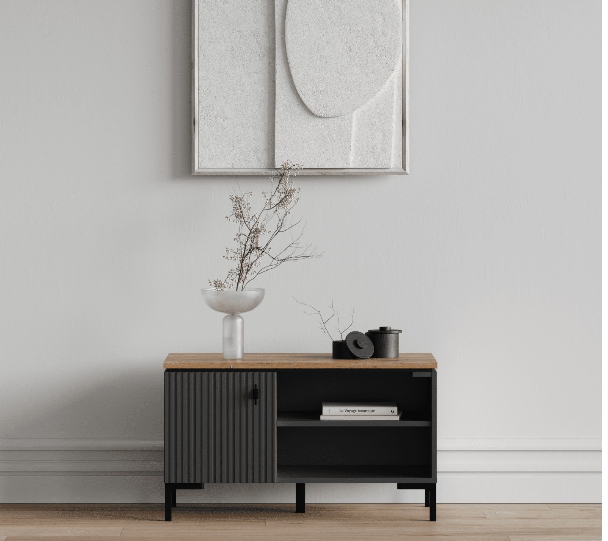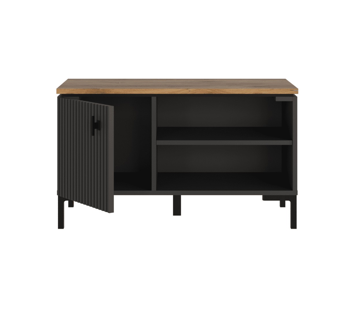 Основная особенность этой тумбы – это открытые полки. Они отлично подходят для хранения журналов книг, аксессуаров или обуви. Рельефная распашная дверь скрывает просторный отдел, где вы можете хранить вещи подальше от посторонних глаз. Черная металлическая ручка не скользит в руке и удобна в использовании.